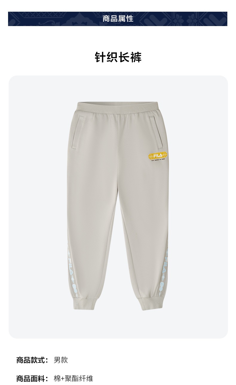 Brand: FILA KIDS Product: FILA KIDS WHITE LINE Boys Knit Pants SKU No. K12B412603FGY Color: Ash Gender: Boys Size: 130-165cm A chic silhouette with an excellent fit. Designed to style as pants. Breathability material, vents for good circulation and evacuation of perspiration.