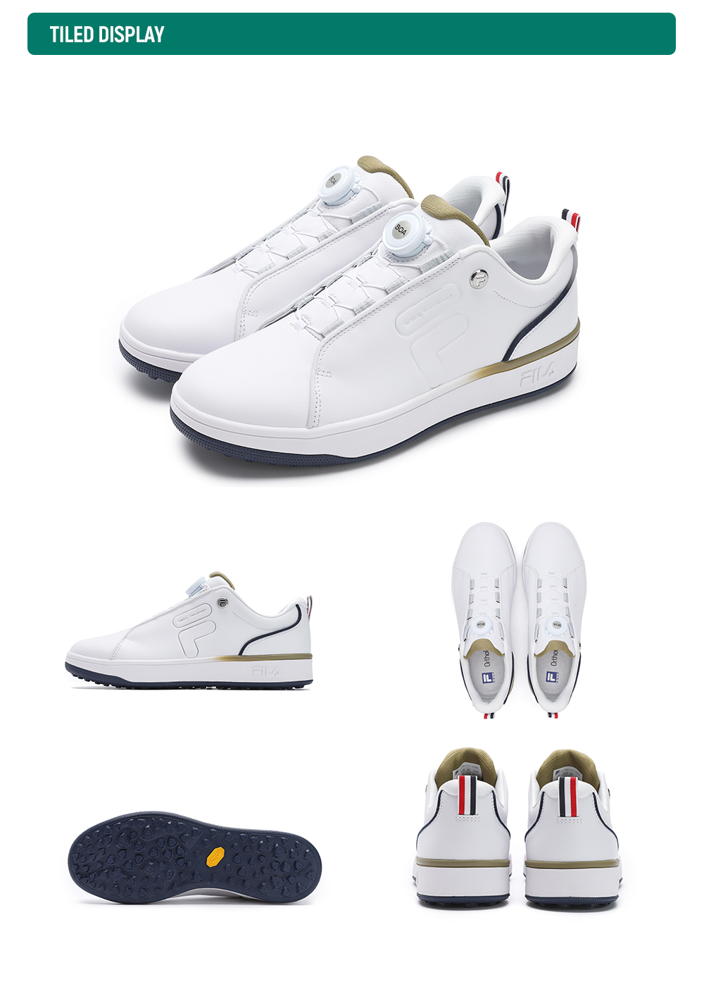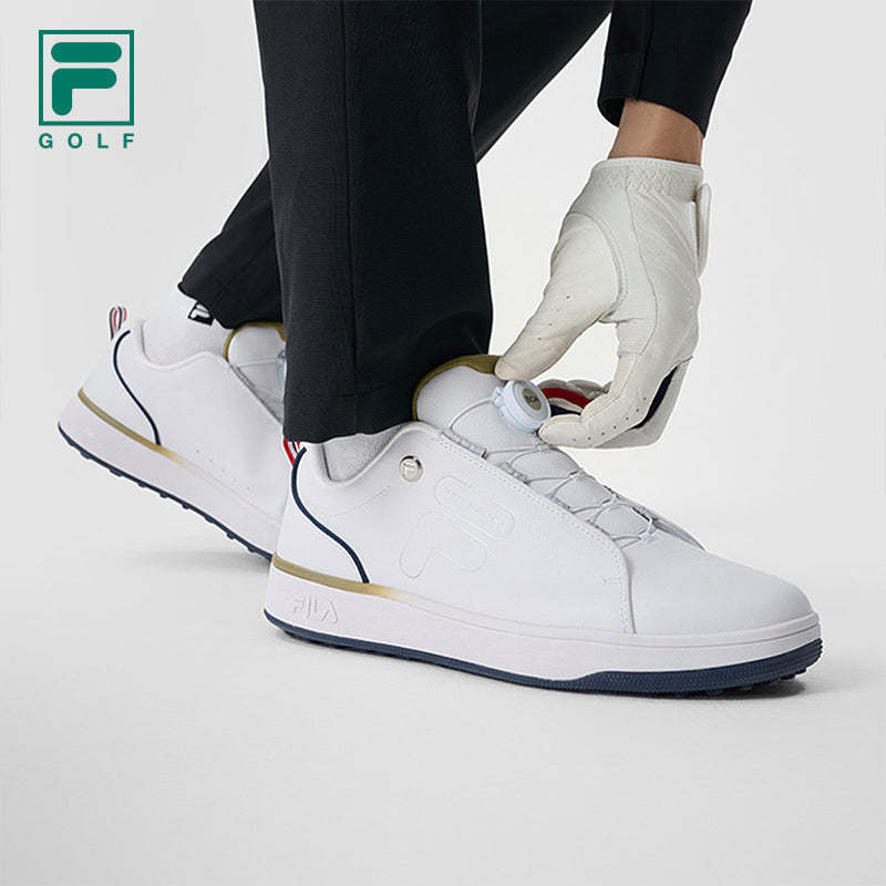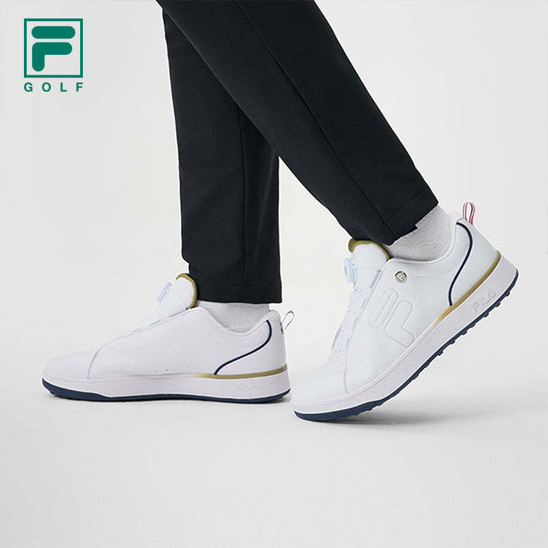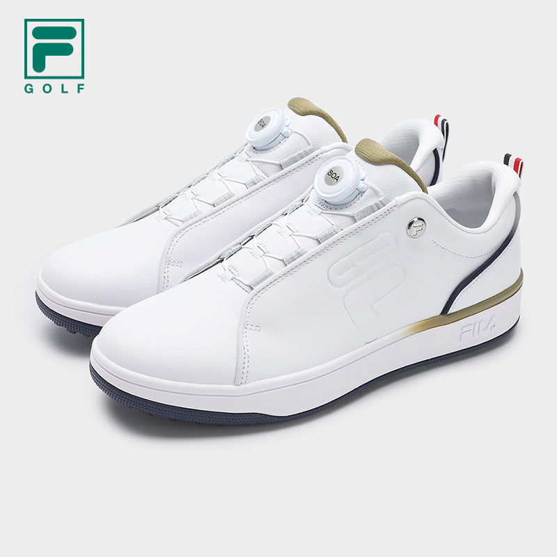 Golf 1911 Trainers is a pair of soft spike Golf shoes by FILA with the patented BOA knob tie. The anti-sand structure of the tongue helps to reduce the entry of sand into shoes. A classic, minimalist yet versatile pair of shoes.