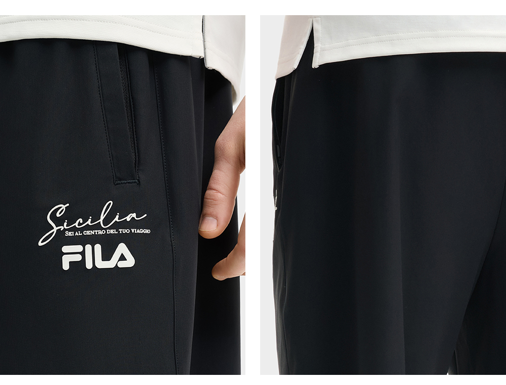 Brand: FILA CORE Product: FILA CORE LIFESTYLE HERITAGE ENDLESS SUMMER IN SICILY Men Knit Pants in Black SKU No. F11M528602FBK Color: Black Gender: Men This season’s urban inspiration comes from Sicily, Italy—a mysterious and romantic island. Goethe once praised, “You can only find the true source of Italy’s beauty in Sicily.” Its charm lies in its rich history, culture, cuisine, and unique natural scenery. From breathtaking views to legendary films like The Godfather and novels like The Sicilian, this beautiful island is steeped in storytelling. This drop explores Sicilian food, ceramics, and other elements through diverse patterns and text, using craft techniques and color palettes to evoke a relaxed vacation vibe.